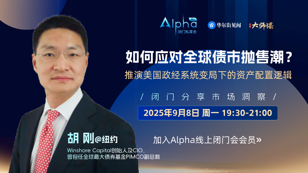 北京時間9月8日晚上19:30,Winshore Capital創辦人兼首席投資官(CIO)、前PIMCO執行副總裁胡剛先生在線上為Alpha專線舉辦閉門私享會,分享如何應對全球債市拋售浪潮,並探討美國政策經濟格局變化帶來的資產配置調整策略。